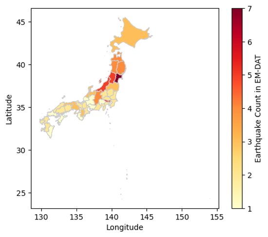 We create a python function, json_to_amdmin1, to extract the administrative level 1 codes from the Admin Units column of EM-DAT, based on the ADM1_CODE and ADM2_CODE of the Japan geodataframe.